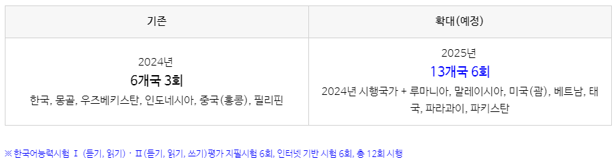 최근 몇 년간 한국어능력시험에 대한 수요가 급격히 증가하면서, 교육부는 2025년부터 한국어능력시험의 인터넷 기반 시험(IBT) 시행 국가와 횟수를 대폭 확대하기로 결정했습니다. 기존 6개국에서 연 3회 시행하던 IBT를 13개국에서 연 6회로 확대하여 시행하게 되는데요, 이는 한국어 학습자들에게 시험 응시의 기회를 더 많이 제공하고, 편의성을 크게 증대시키기 위함입니다.