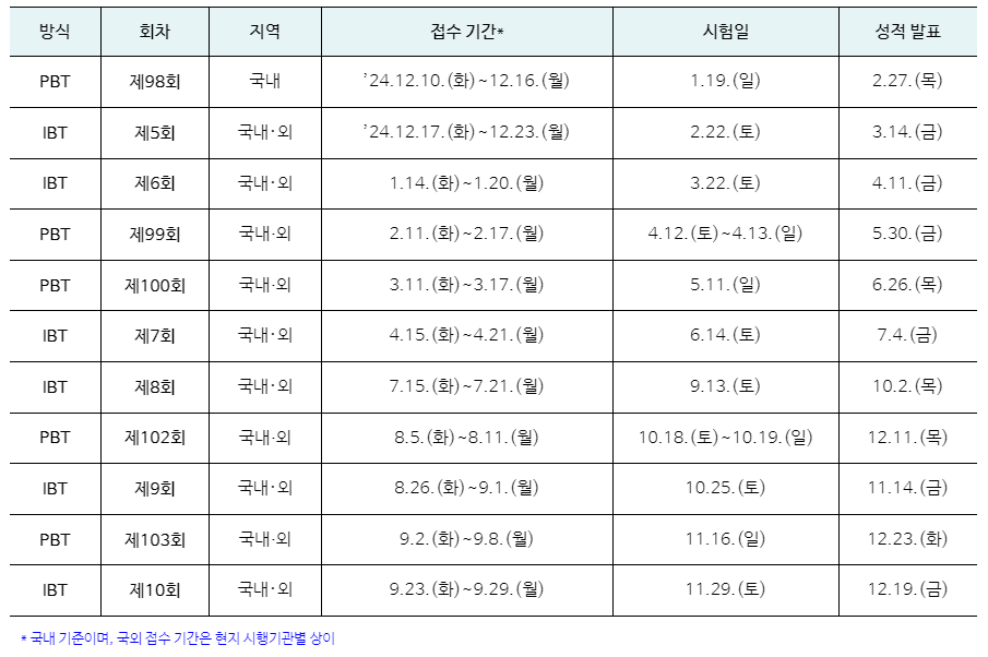- IBT 방식: 총 6회 시행 (국내 및 국외)